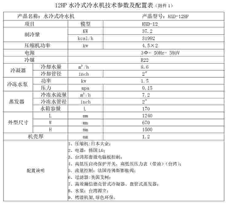 深圳瀚信德制冷生產(chǎn),銷售的水冷式注塑機(jī)專用冷水機(jī)組品質(zhì)優(yōu),外形美觀,價(jià)格優(yōu)惠,廠家直銷讓使用廠家得到更多的實(shí)惠,還有個(gè)更大的好處就是方便提供快速準(zhǔn)確的技術(shù)支持,而一般的銷售商沒(méi)有太多的技術(shù)知識(shí),12HP水冷式注塑機(jī)專用冷水機(jī)價(jià)格,含稅不含運(yùn)費(fèi)23800元一臺(tái),技術(shù)參數(shù)與配置如下所示!