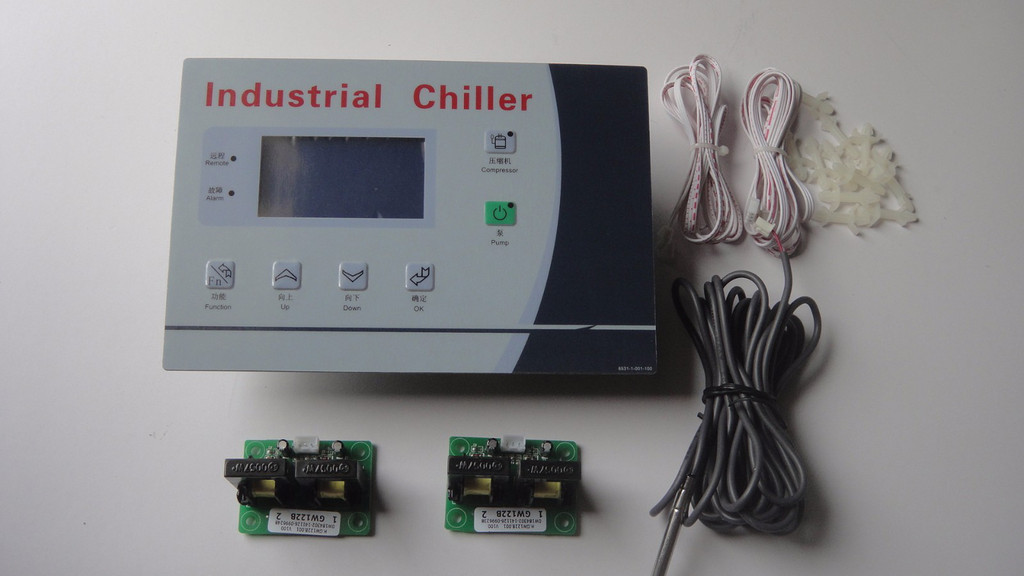 GW532A冷水機控制器,冷水機專用液晶顯示控制器一套(包括:安裝鐵板,控制主板,(電流互感器2個/選配件)面貼,數據線,感溫線,產品說明書)